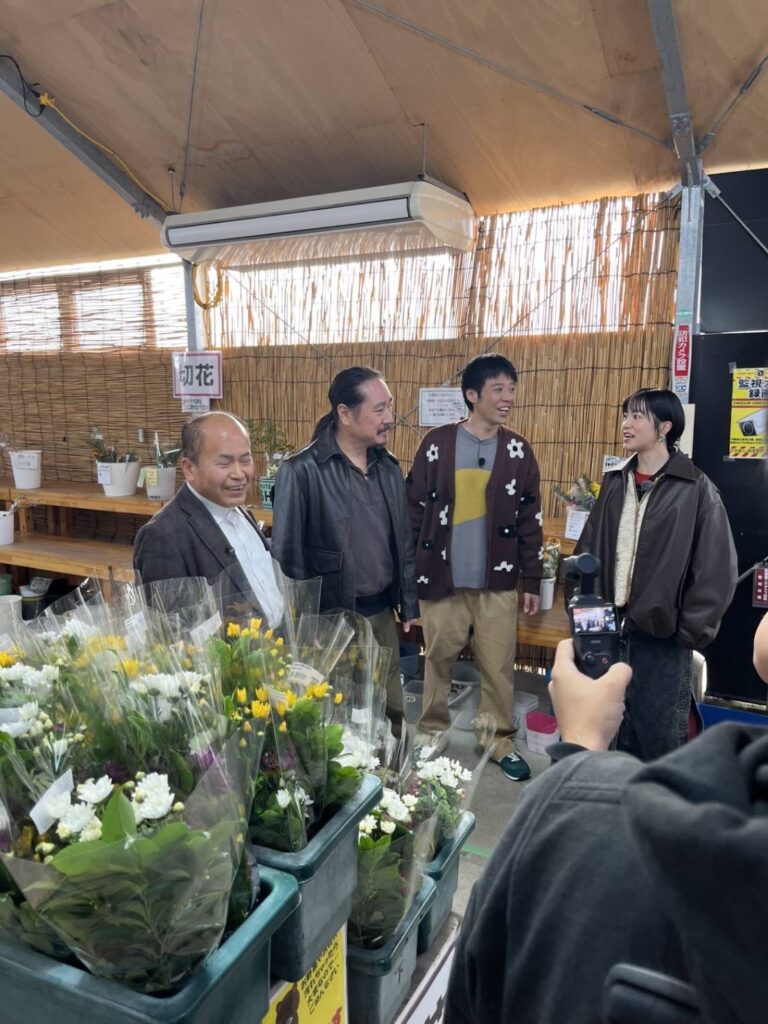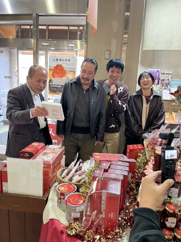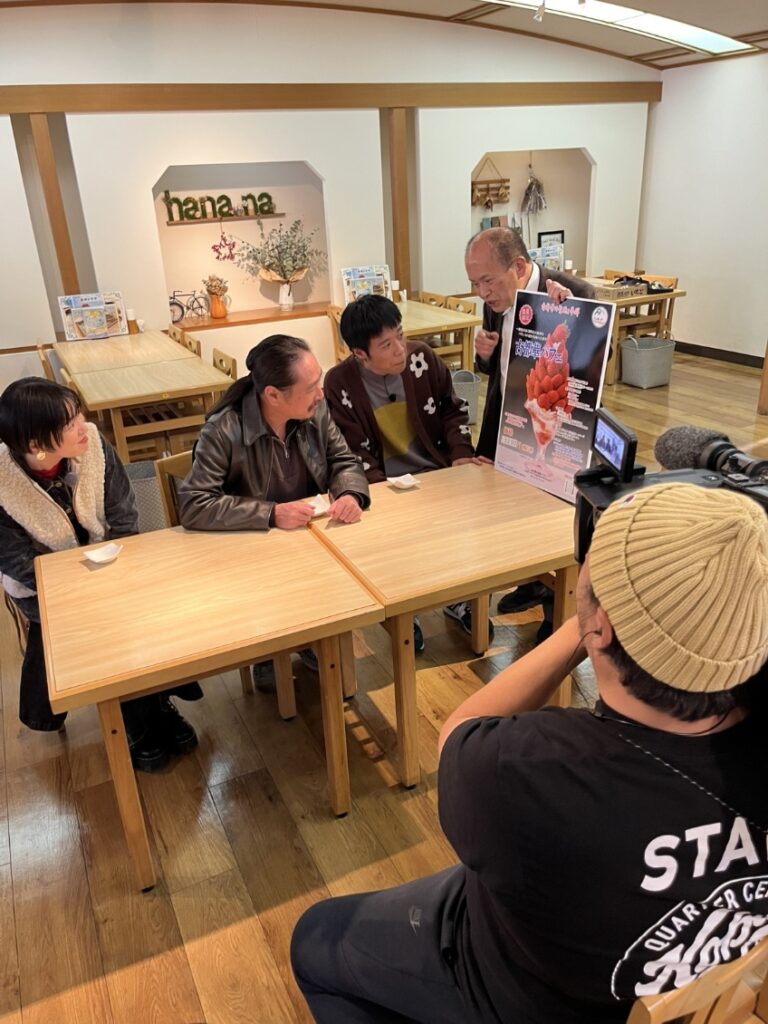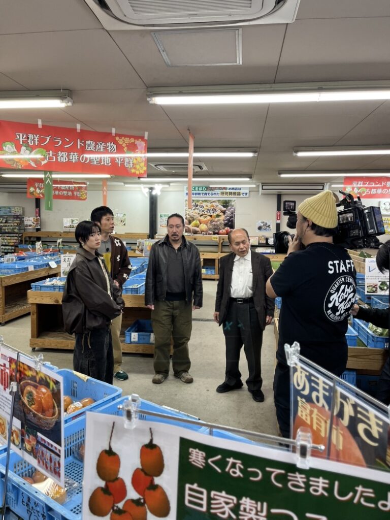平群の美味しい野菜や果物、小菊などの生花、古都華などを紹介され、出題される大喜利に挑戦します。
