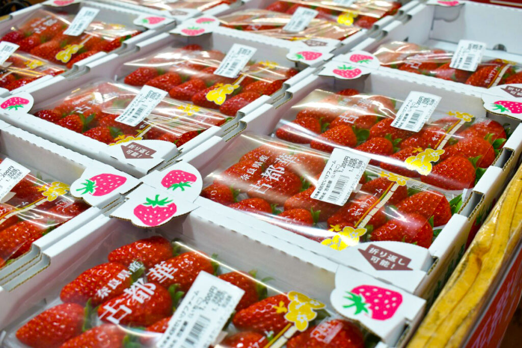 「とれたて市」では、平群ブランドの古都華をパックや箱で販売しています。