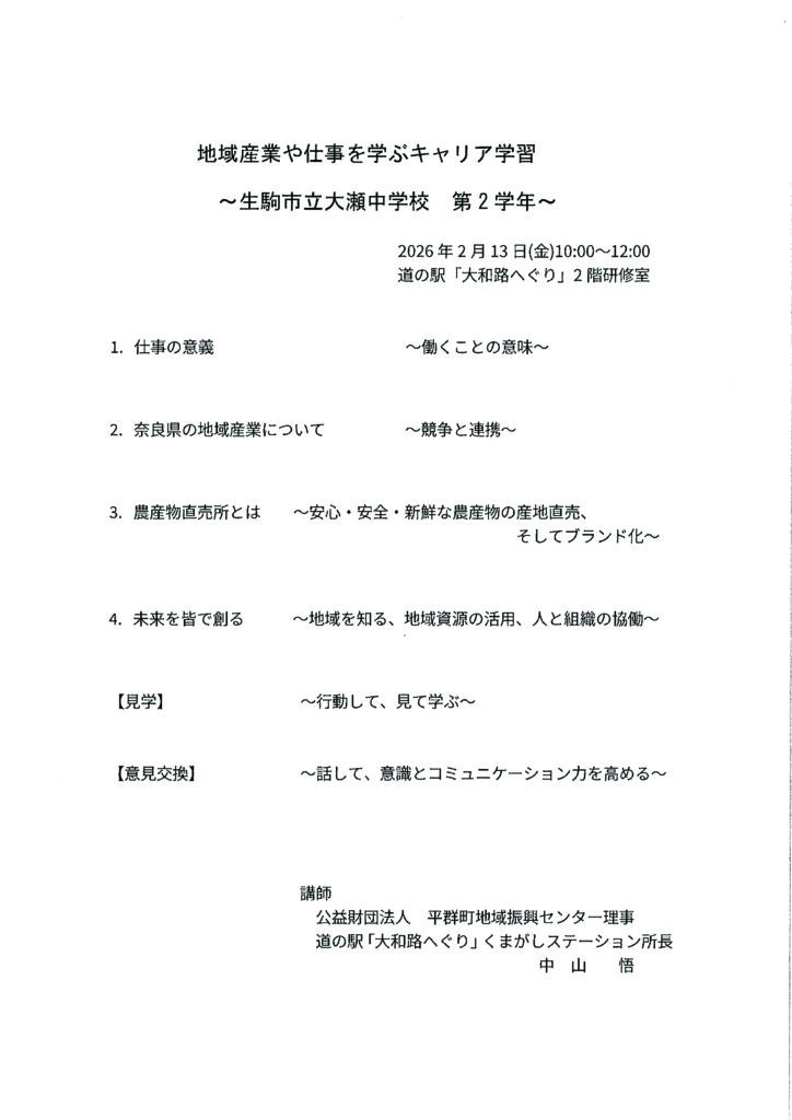 道の駅「大和路へぐり」2階研修室にて、働くことの意味、奈良県に地域産業についてなどの講習会を行いました。