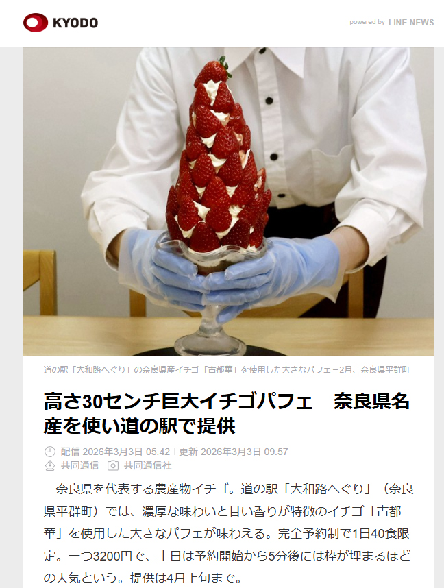 奈良県を代表する農産物イチゴ。道の駅「大和路へぐり」(奈良県平群町)では、濃厚な味わいと甘い香りが特徴のイチゴ「古都華」を使用した大きなパフェが味わえる。完全予約制で1日40食限定。一つ3,200円で、土日は予約開始から5分後には枠が埋まるほどの人気という。提供は4月上旬まで。