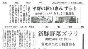 道の駅大和路へぐり登録・開業25周年記念の展開のマスコミの反響記事掲載 11月1日~3日は、道の駅重点マルシェを行い、2日、3日は「謝恩大抽選会」を実施しました。 来訪者の笑顔あふれる姿に道の駅スタッフは、これまでの来訪 […]